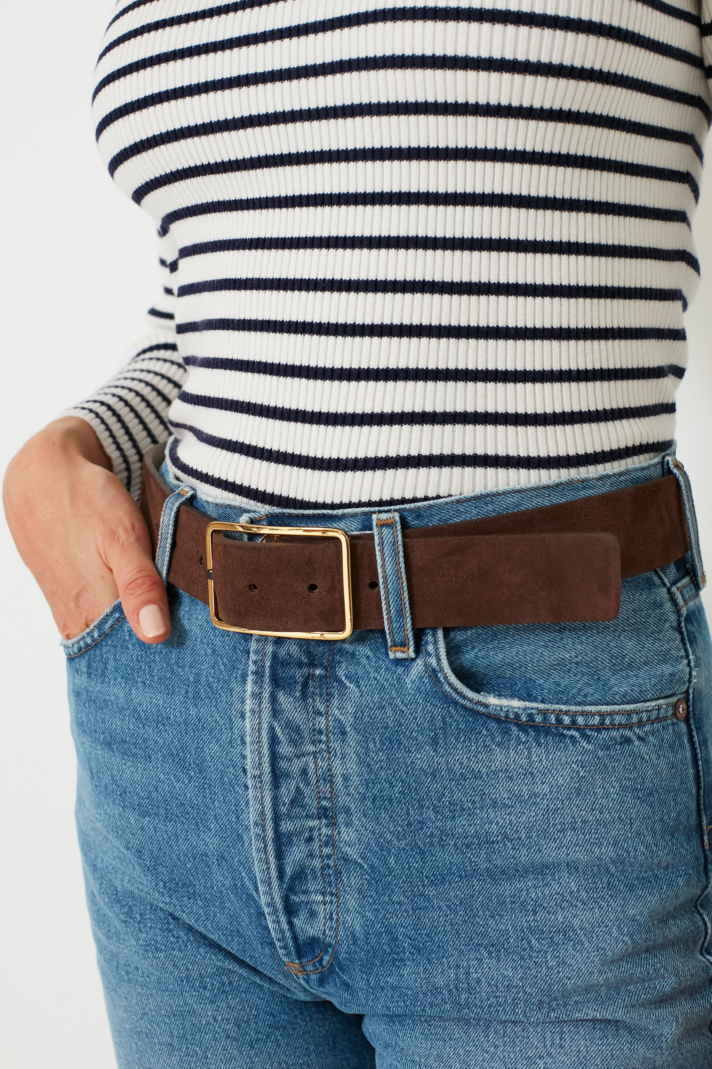 A versatile and timeless accessory to elevate your outfit - the Chocolate Suede Milla Belt is crafted by a luxurious velvety Italian suede and finished with the brand's signature rectangular buckle in a polished gold-tone finish. Versatile and sleek. it pairs seamlessly with pants. dresses. skirts and more. ensuring a sophisticated look for any event.
