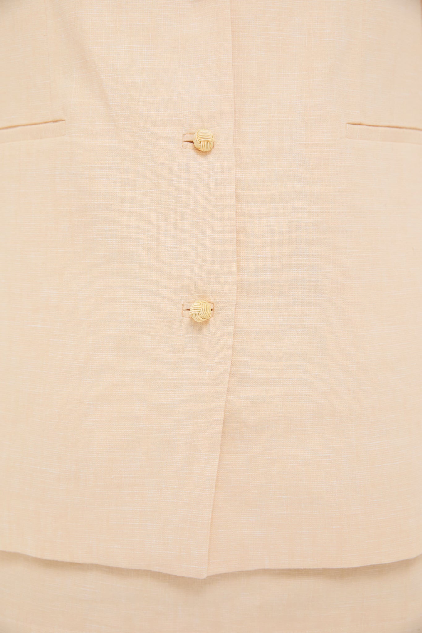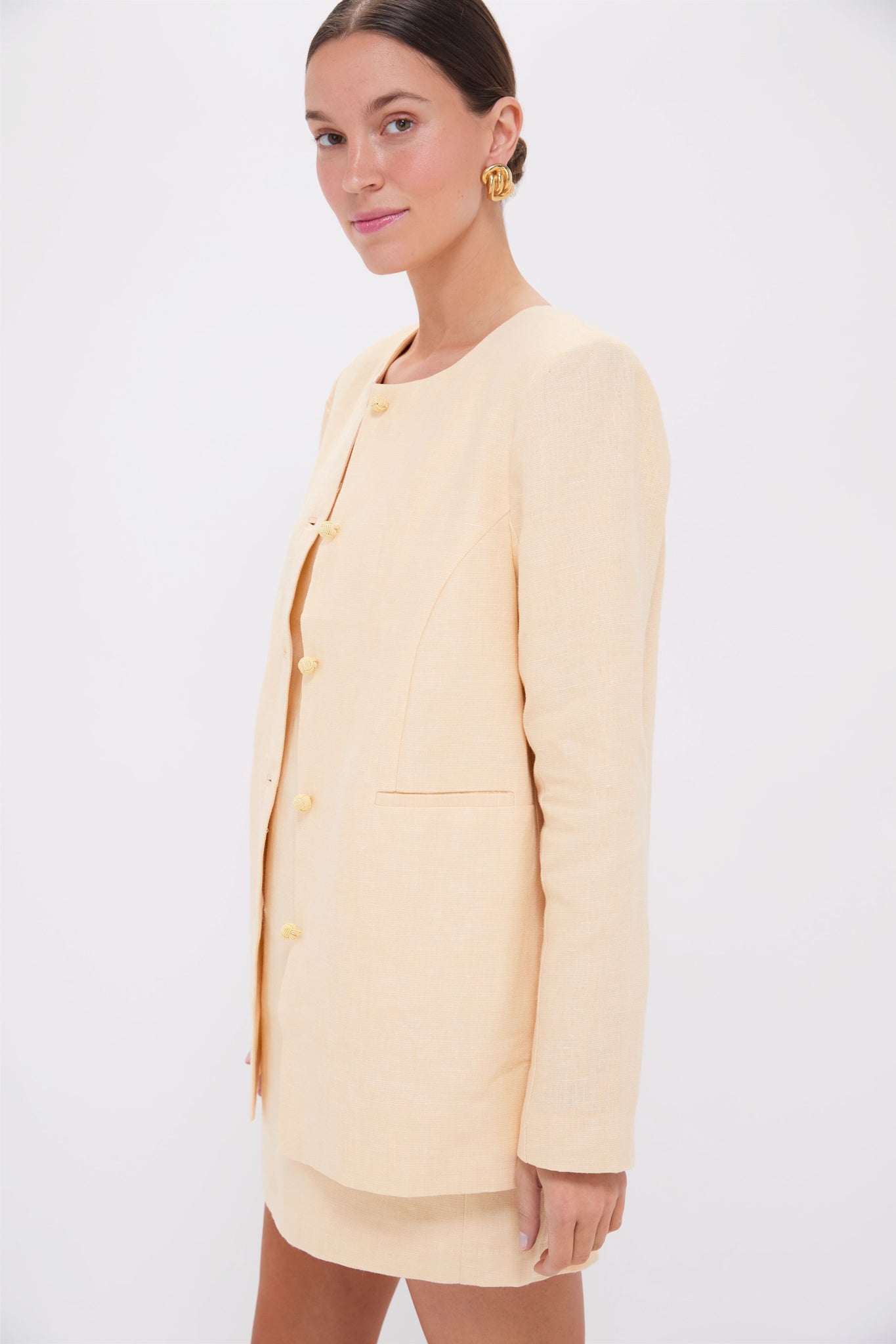 The Rio Jacket is a classic staple you'll cherish for years to come. Tailored from certified linen. padded shoulders frame the boxy silhouette while self-covered buttons extend down the centre front. Wear yours everywhere from the office to date night. We styled it with the coordinating Dusty Citron Rio Mini Dress. a chic ballet flat. and handbag!