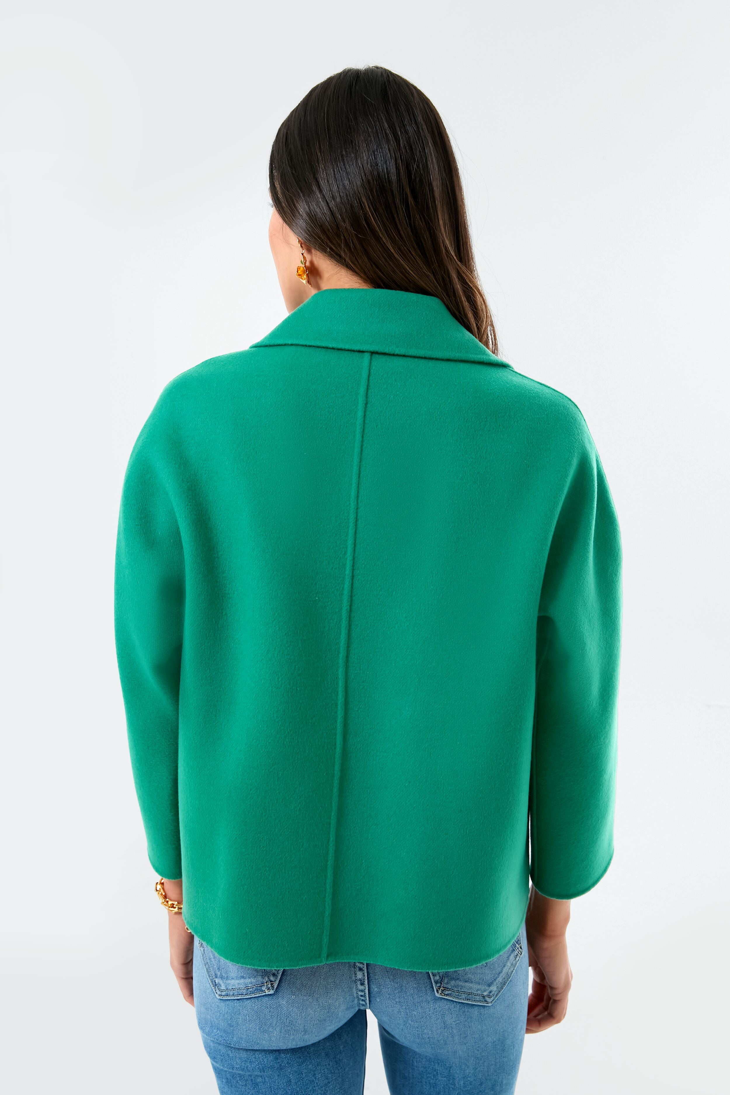 In need of a pop of color? The Green Panca Coat is here to deliver! In a stunning. bright emerald hue. this slightly cropped. double-faced wool jacket is one of our favorites for spring days that still have a bit of a chill in the air. Add a lapel collar. bracelet length wide sleeves. and oversized patch pockets. and then you have a sophisticated outer layer that looks great with anything from denim to day dresses.
