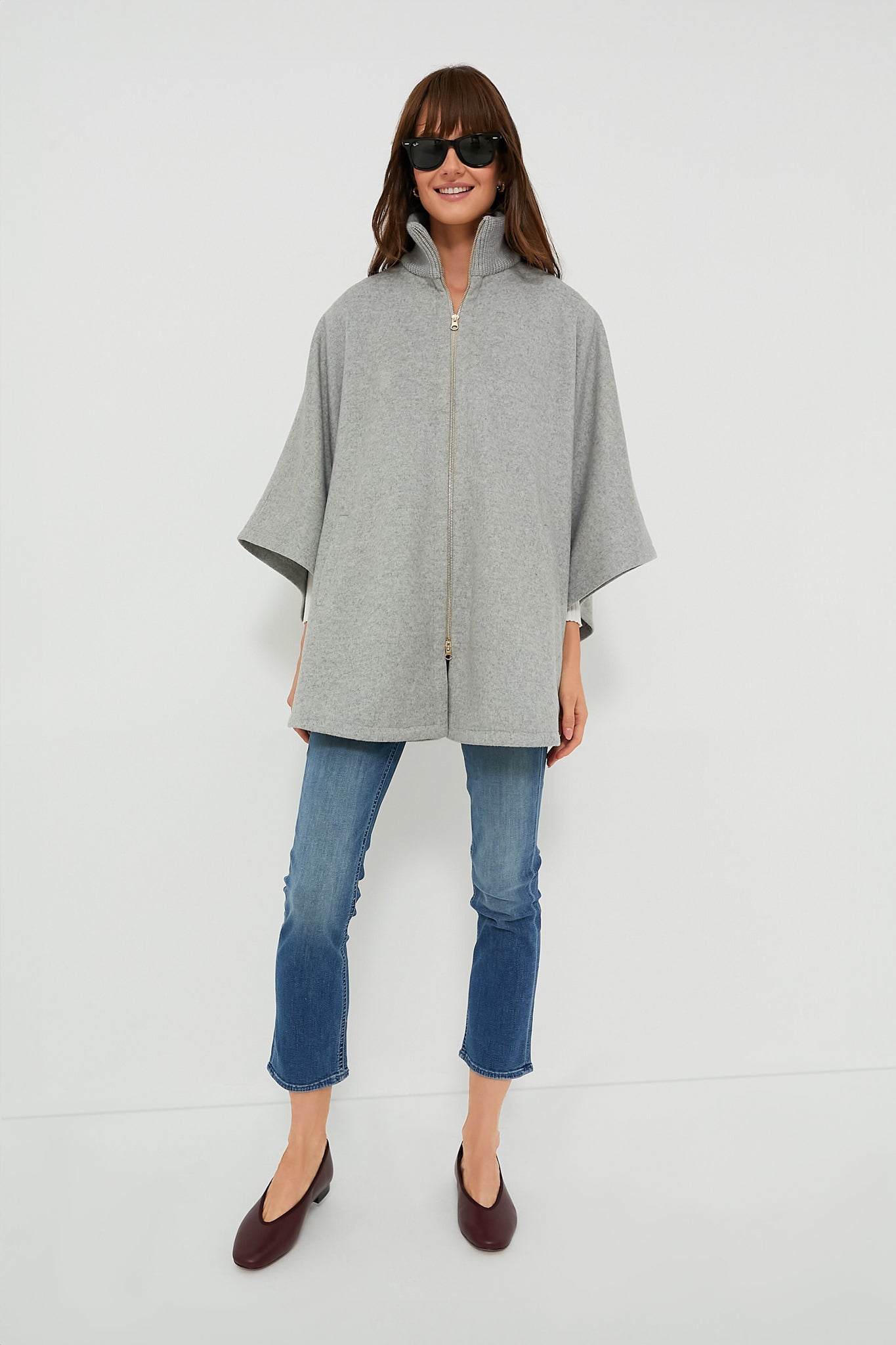 The Grey Full Zip Huntington Cape is a closet must-have for the cold-weather months. The oversized silhouette makes this the perfect layering piece. and the zip closure allows this to be worn on its own or over a button-down. With a wool blend. you are sure to be comfy and cozy in this stylish look- pair with denim and loafers or with a dress and boots for an absolutely elegant outfit.