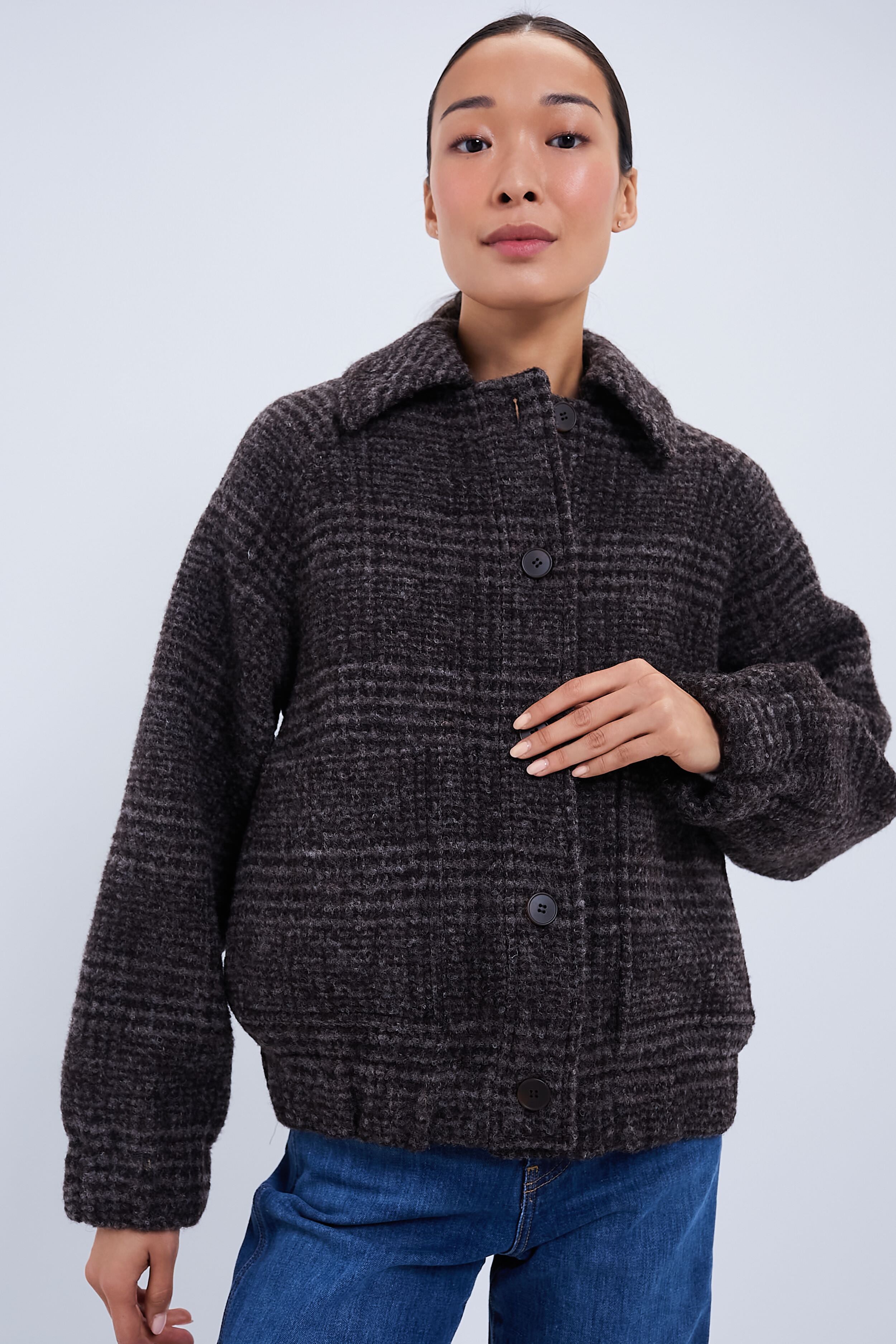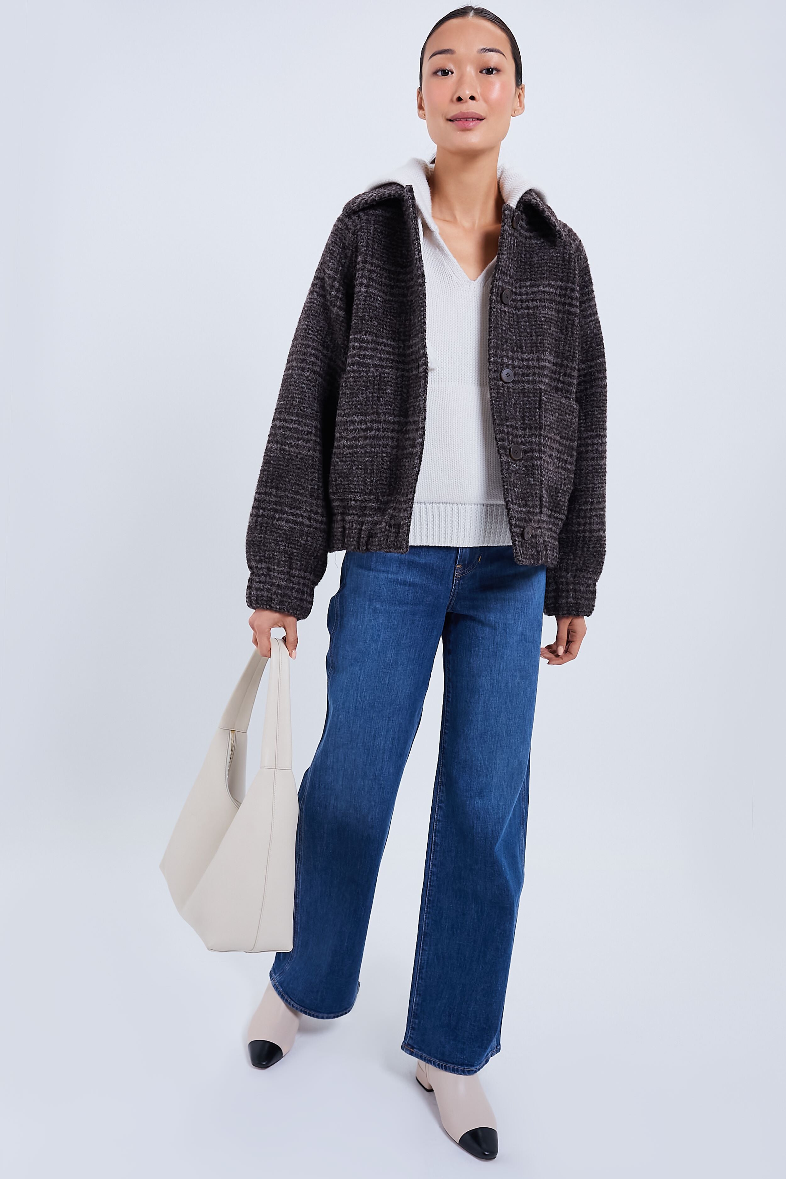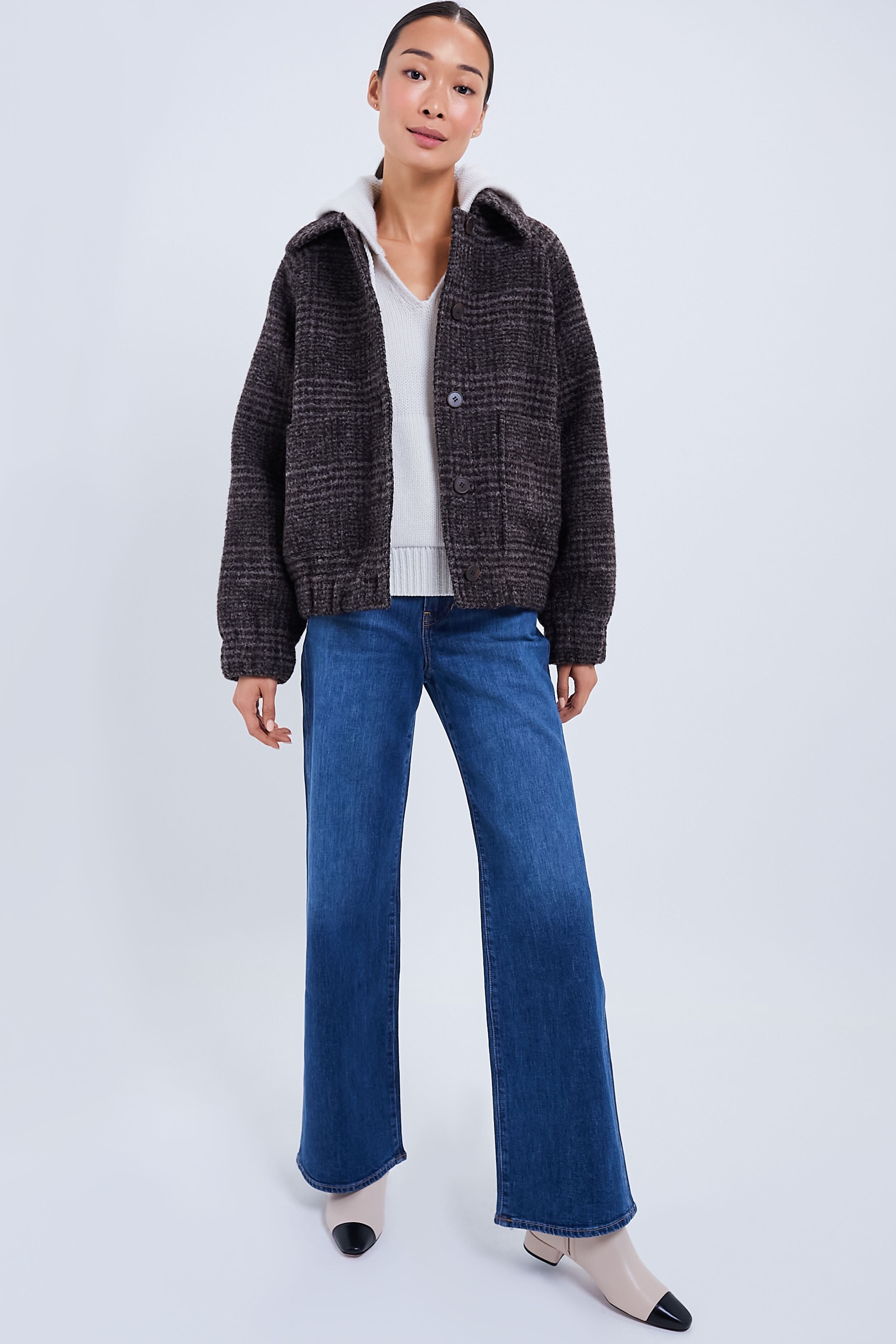 A classic bomber updated with luxe tweed