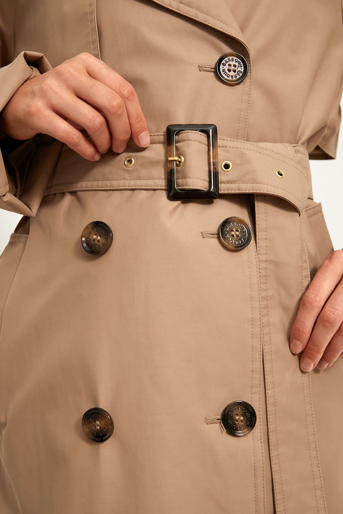 Boasting a beautiful brand signature tartan lining and adorned with faux horn trims. the Honey Gwyn Showerproof Trench Coat is an elegant take on the classic and forever timeless style. Featuring a point collar. double- breasted front. and removable belt. this water-resistant silhouette has all of our favorite details. Perfect for wet. chilly commutes to the city or strolls in the park. this piece can be worn over all your favorite outfits from cocktail dresses to athleisure!