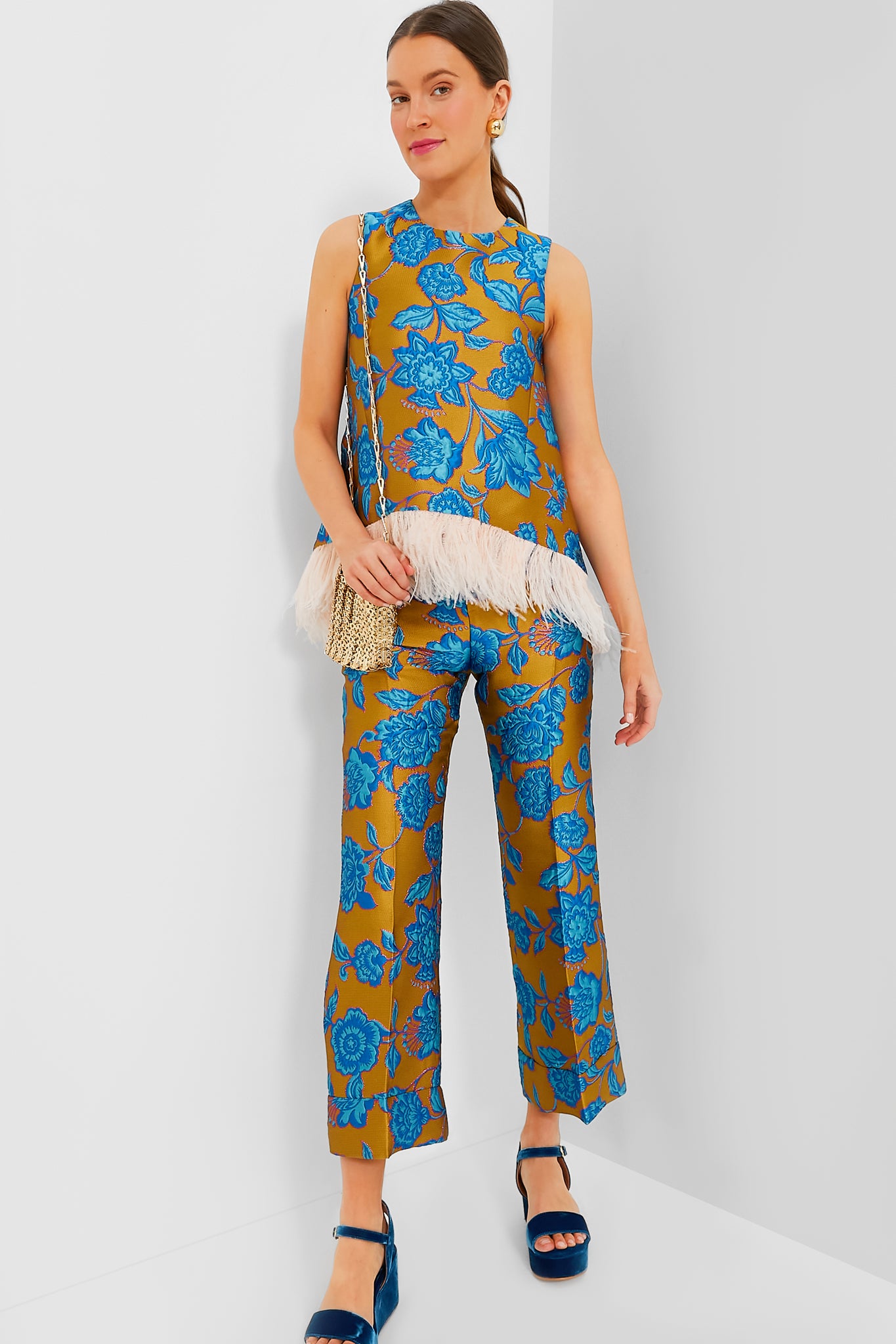 The Hottie Jacquard La Scala Top wins the gold in our books! Prime for summer weddings. black tie beach parties. and beyond. this alluring trapeze silhouette is crafted from a shimmering jacquard fabric and hemmed with a fabulous ostrich feather trim that brings the drama. Style with the matching Hottie Jacquard Hendrix Pants for a chic-coordinating look. or it slips in effortlessly with any denim and ballet pumps for a fun brunch look.