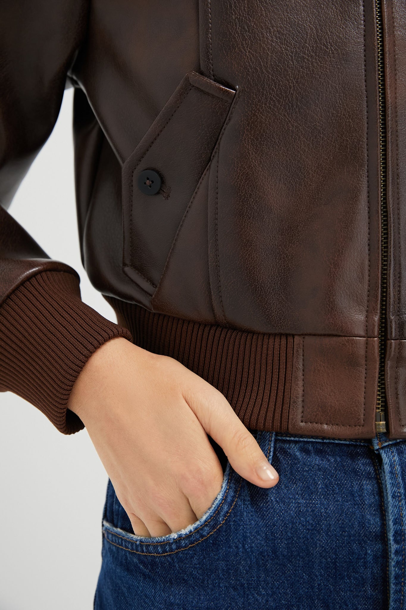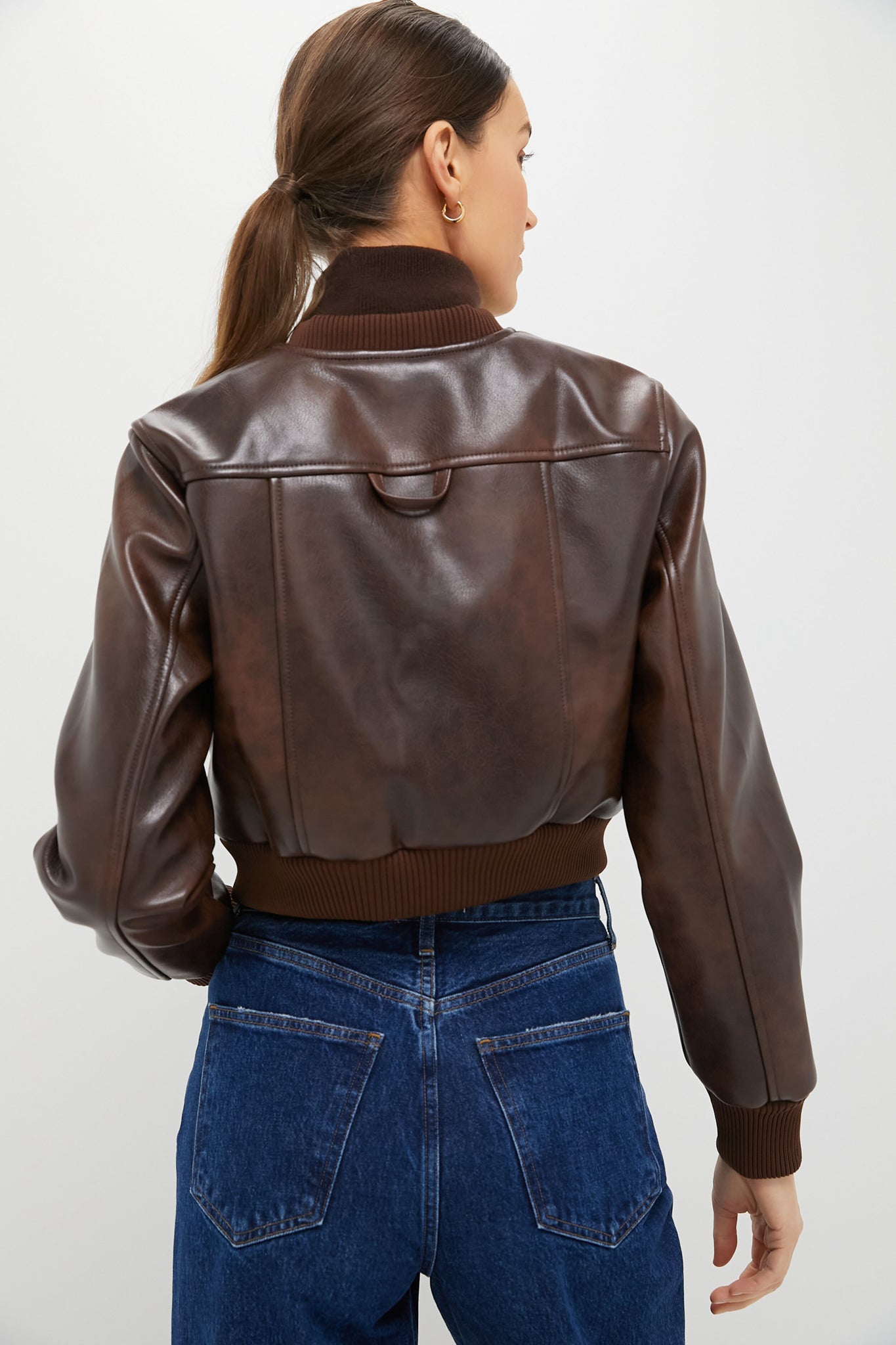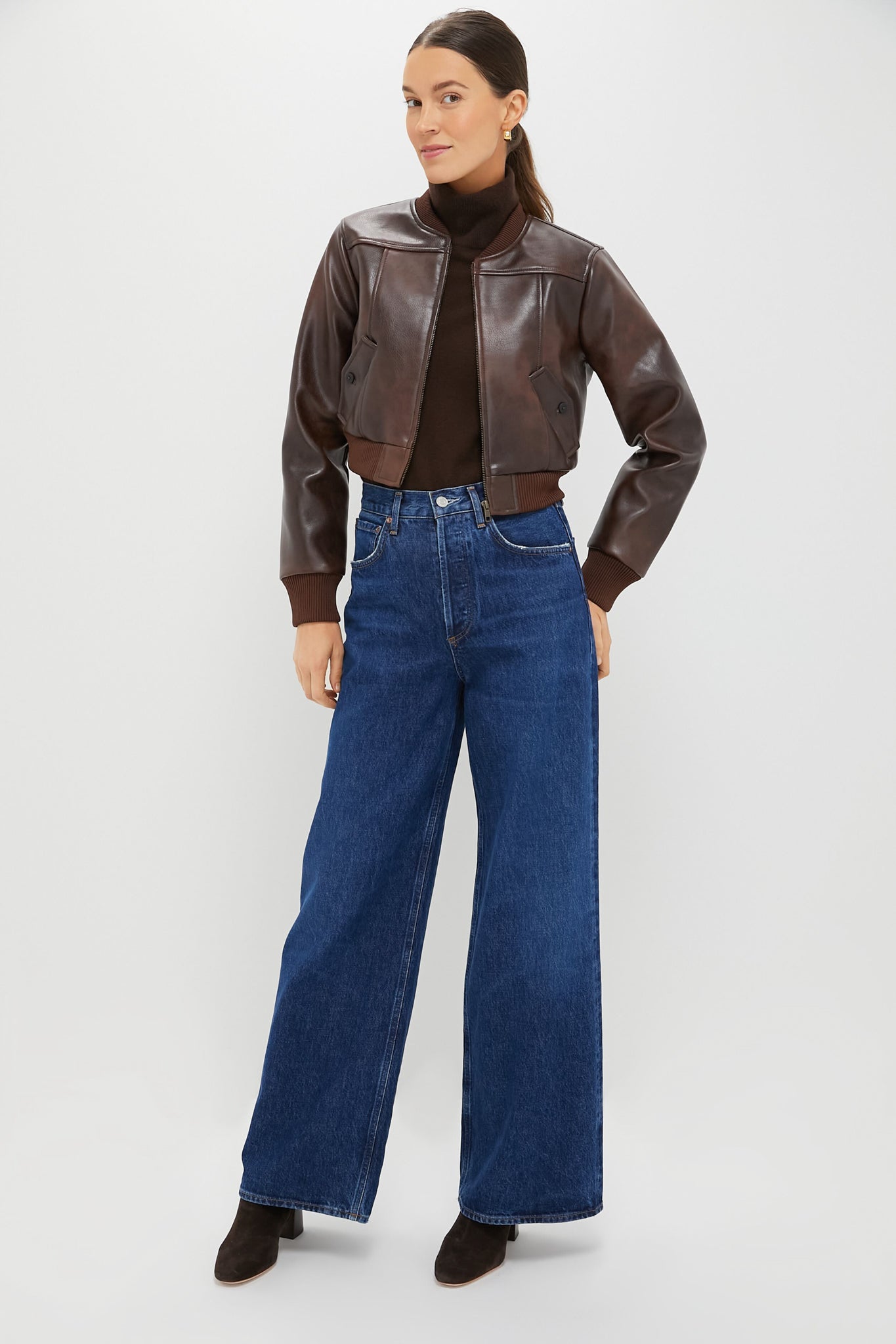 A cropped bomber jacket with a crewneck. side slit pockets. seamed details and a zip closure. The If You Say So The Cockpit Bomber Jacket is made in a classic brown with vintage-inspired details and ribbed hems. We paired it with a brown cashmere sweater. dark denim. and boots for a ultra chic look!