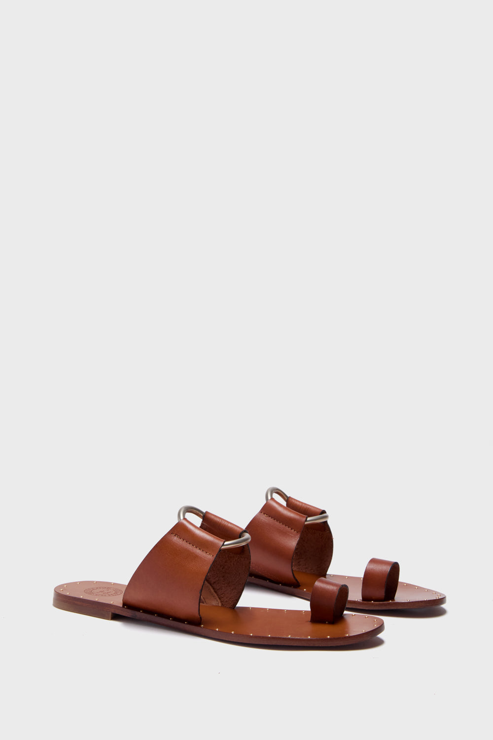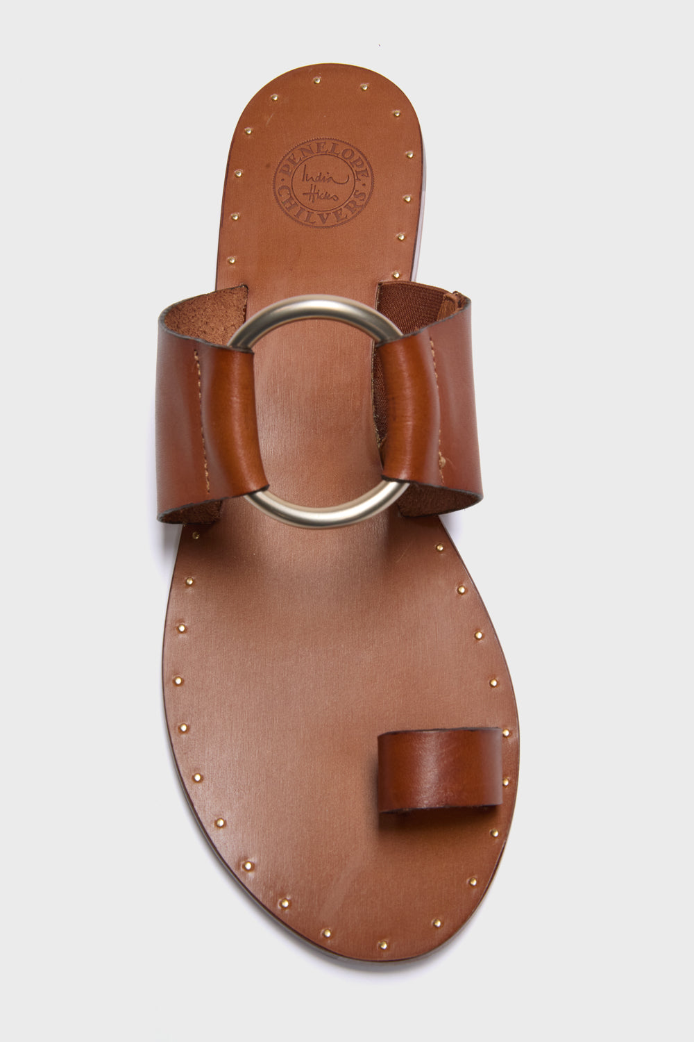 Inspired by the elegant Madame Ghani and her splendid stately home. this is a sandal with smooth edges. and a sleek silhouette. The curved gold ring adornment was added for decorative impact like so many moments found inside Madame G's home. Villa Verde.