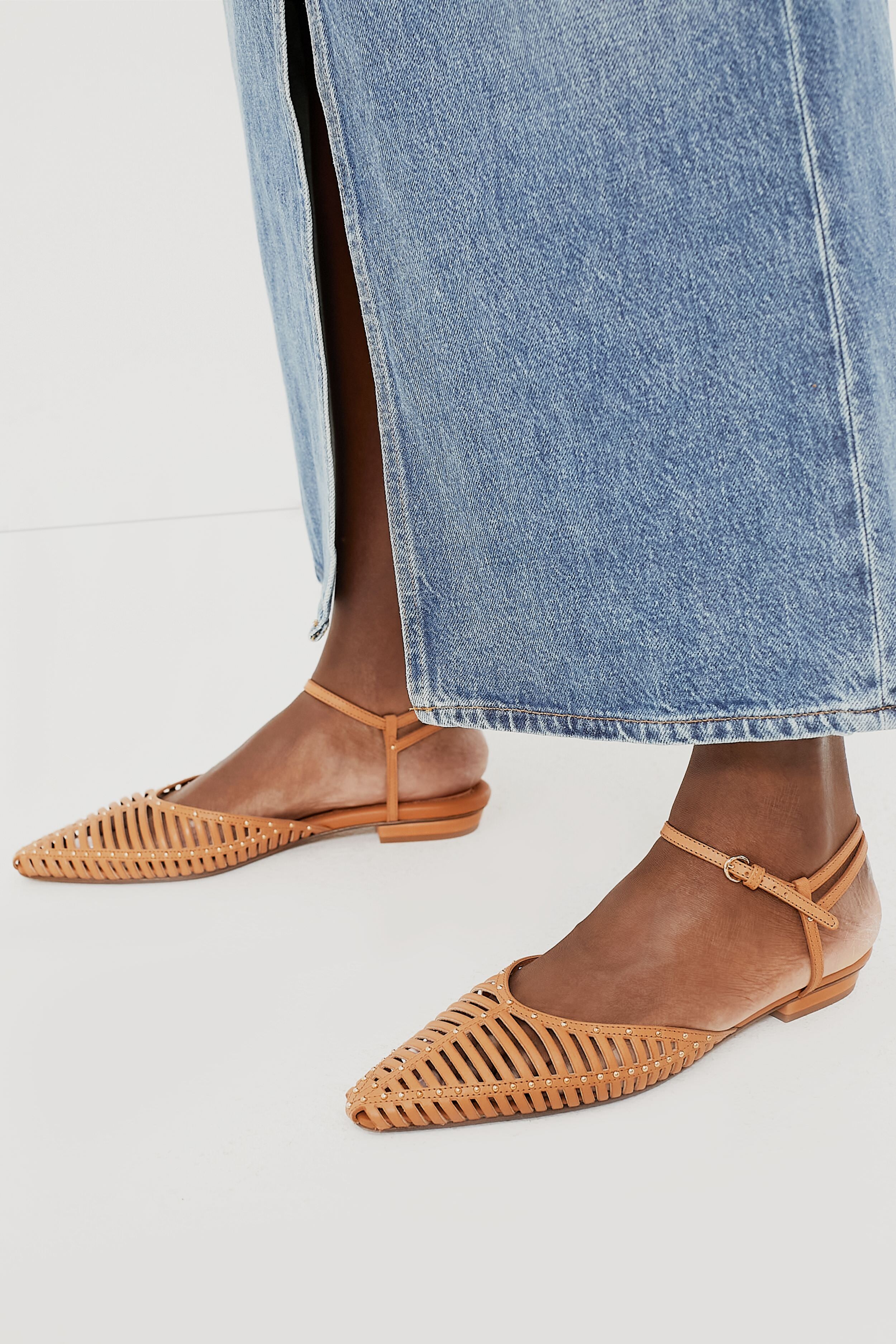 You'll impress everyone with every step you take in the Rust Cage Flats. Crafted in Italy from supple beige leather. these feature a lovely open construction that's embellished with tiny golden studs. With a slight heel and a sleek pointed toe. these are perfect on a beach getaway or for a cool vibe for a weekend in the city. Wear them with a maxi for a fun look. or style them with jeans and a blouse for a chic and polished appearance.