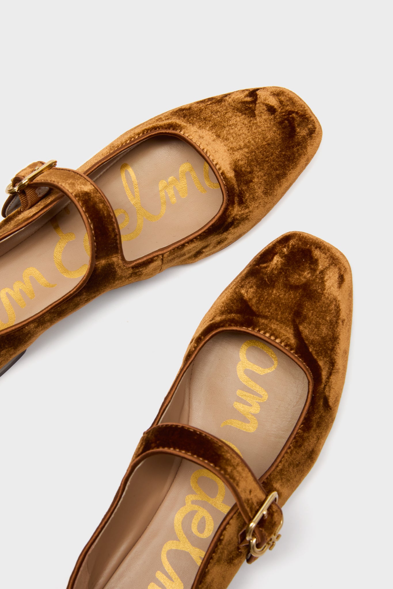For a timeless look that never gets old. step into the Spiced Camel Michaela Flats. These elegant square-toed mary janes are elevated with a velvet exterior and gold buckle closure. Pair with everything from trousers and blazers to dark wash denim and cardigans.