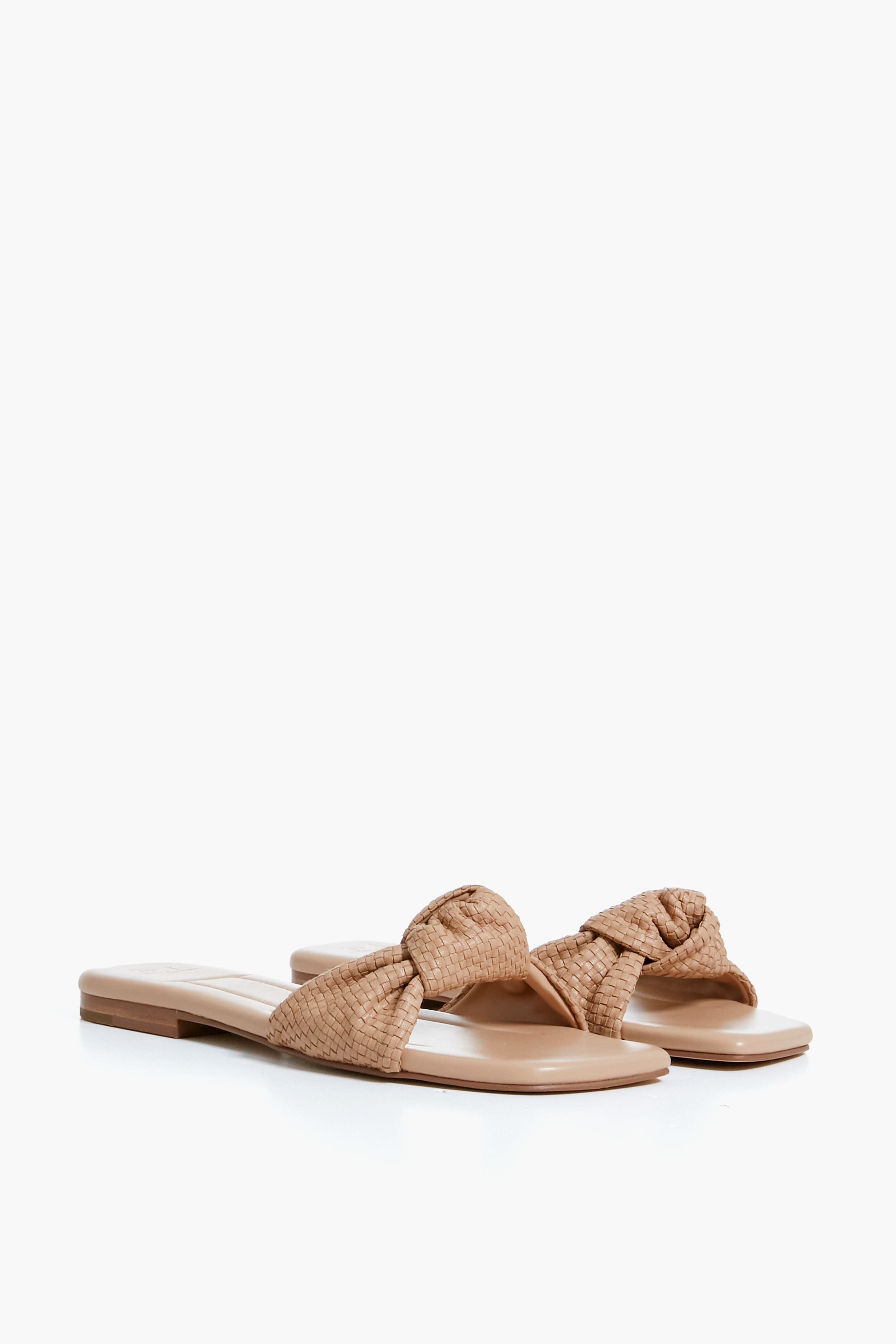 Effortlessly complement any warm weather look with the Tan Marlon Sandals. With a comfortable and super wearable flat heel. as well as a woven upper with a knot detail that was made to stand out from the boring shoes of yore. we know you're going to reach for these over and over again. Contemporary with its square toe. yet classic enough to keep for years to come. we love pairing these with flowing dresses to outdoor dinners. with swimwear by the pool. or with denim shorts to run errands.