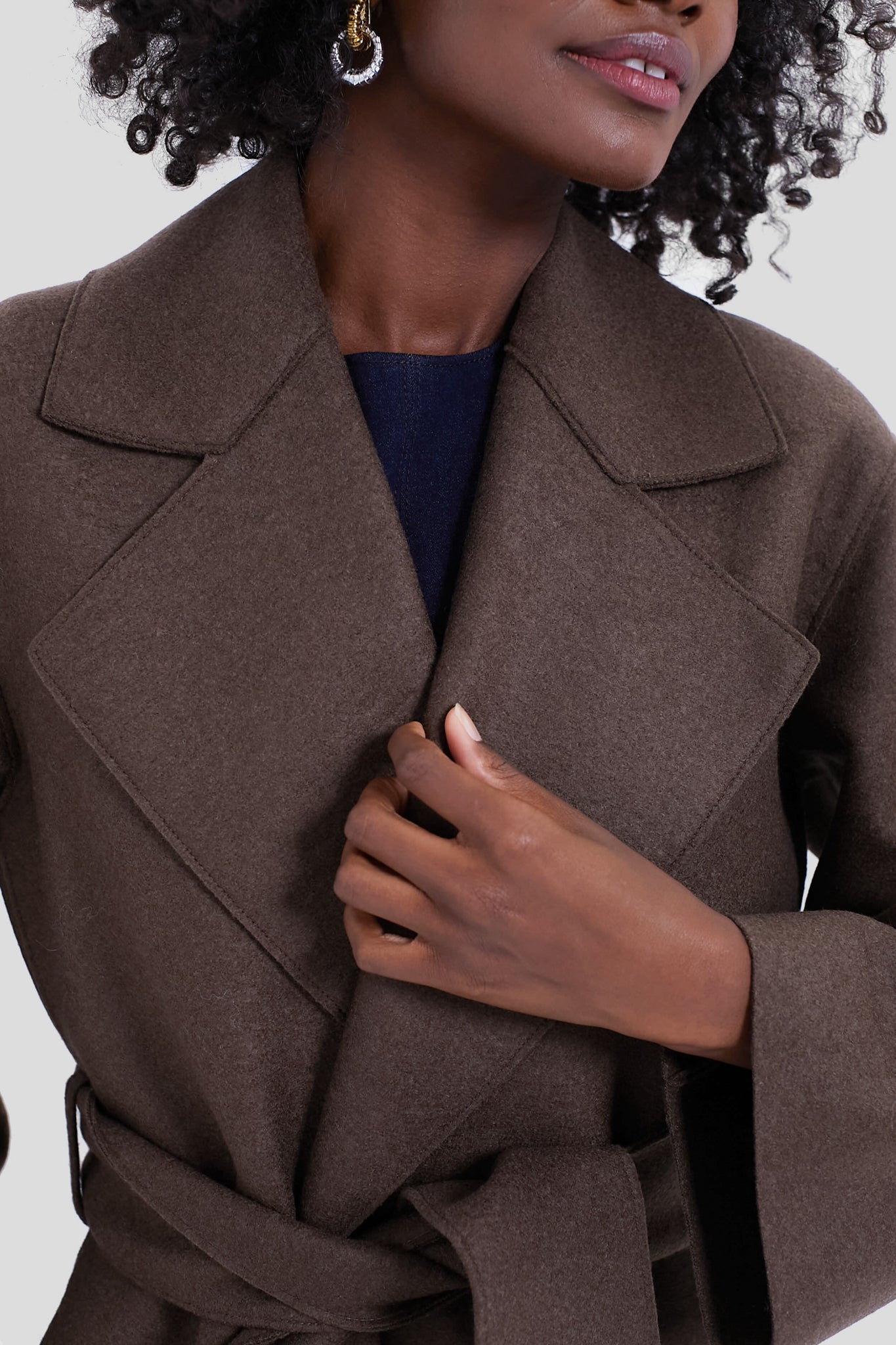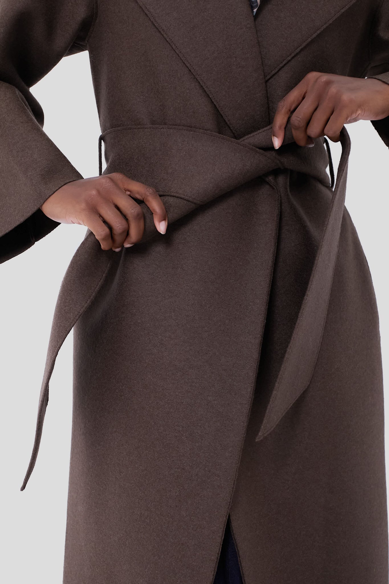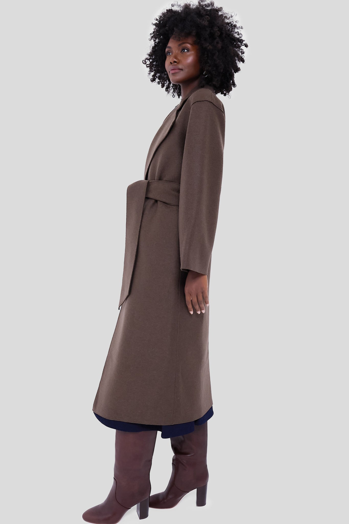 Crafted from a luxurious pure wool fabric. the Teddy Brown Belted Clutch Pressed Wool Coat has us craving cold weather days. This wraparound silhouette boasts a wide lapel collar. long sleeves and side pockets. Finished with an self-tie belt for a look that's equally fashionable as it is functional — style with go-to denim and sleek boots for an effortlessly chic outfit formula.