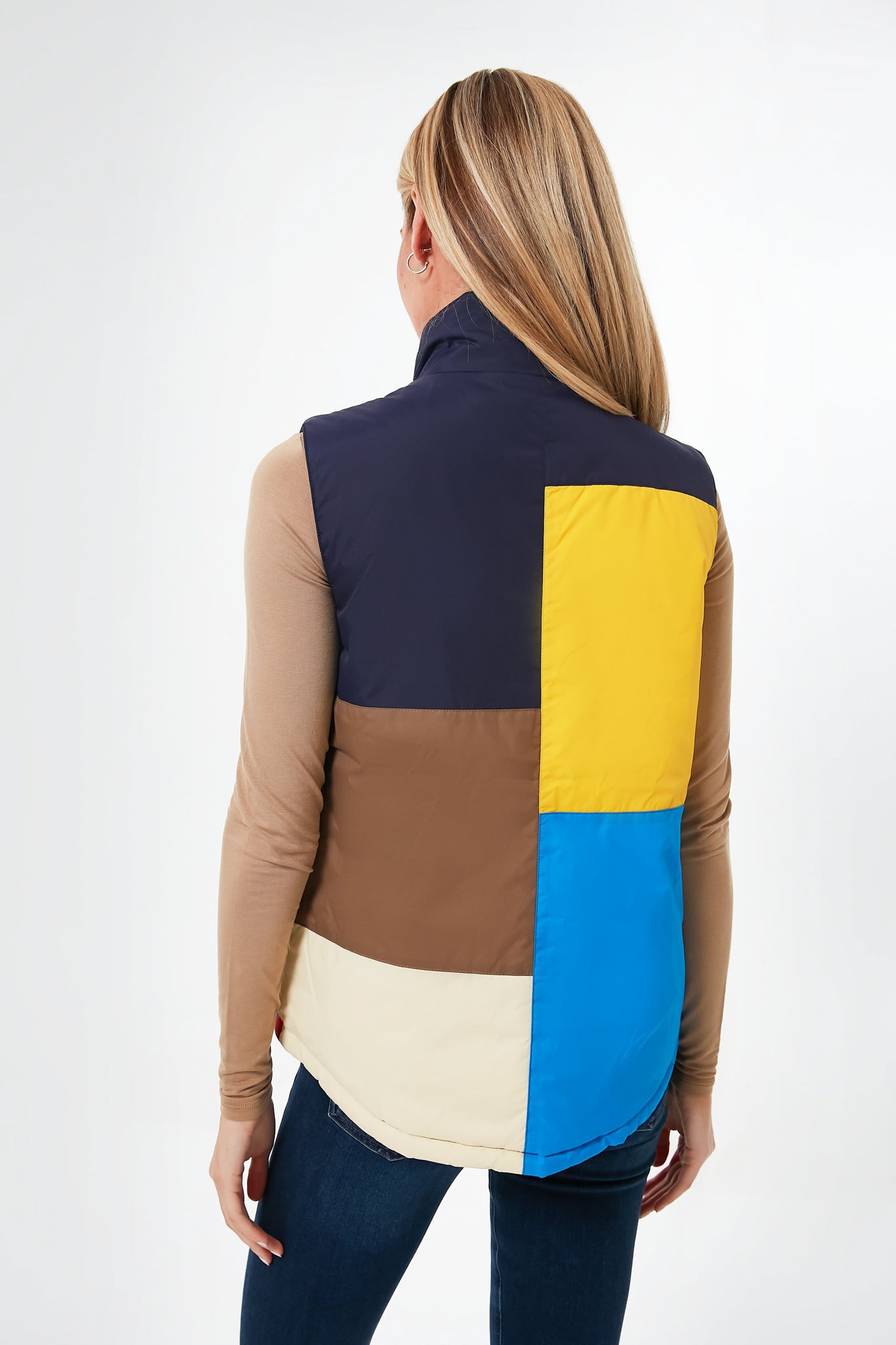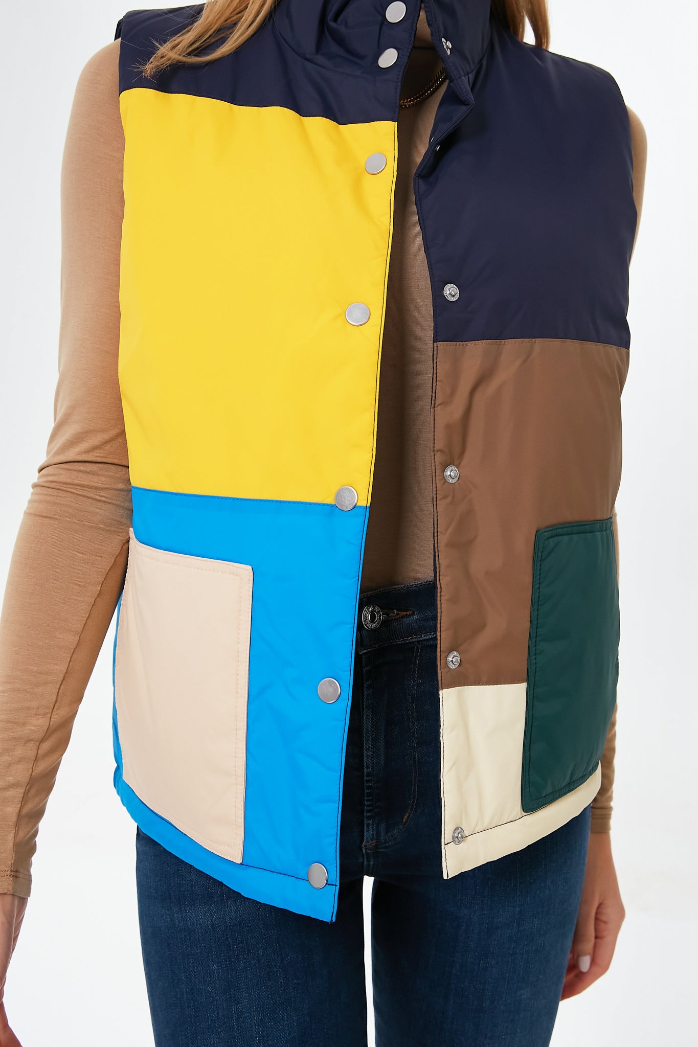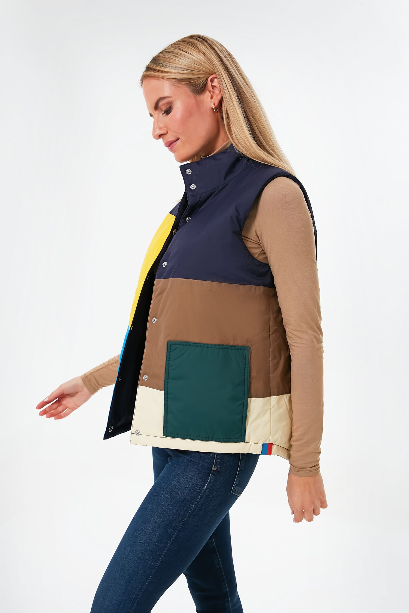 The Multi Chandler is a sleeveless colorblock puffer that brings the perfect pop of joy you need for your fall look. It's reversible with the other side in solid navy for more subtle moments. and it has plenty of storage in its front patch pockets. Wear over a neutral turtleneck for a cheery look. and grab a tote bag to go with you to have fun weekend adventures in your chic vest.
