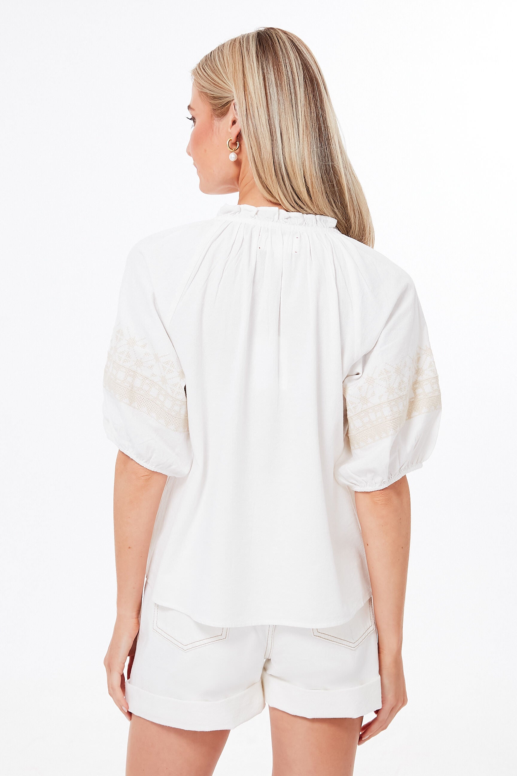 The White Janie Top features cotton crepe fabric. making it light and easy to wear. A ruffled neckline and geometric embroidered bubble sleeves play perfectly for a feminine silhouette that fits just right. Opt for white denim and strappy sandals for an effortlessly cool-girl look as you head out to explore on vacation.