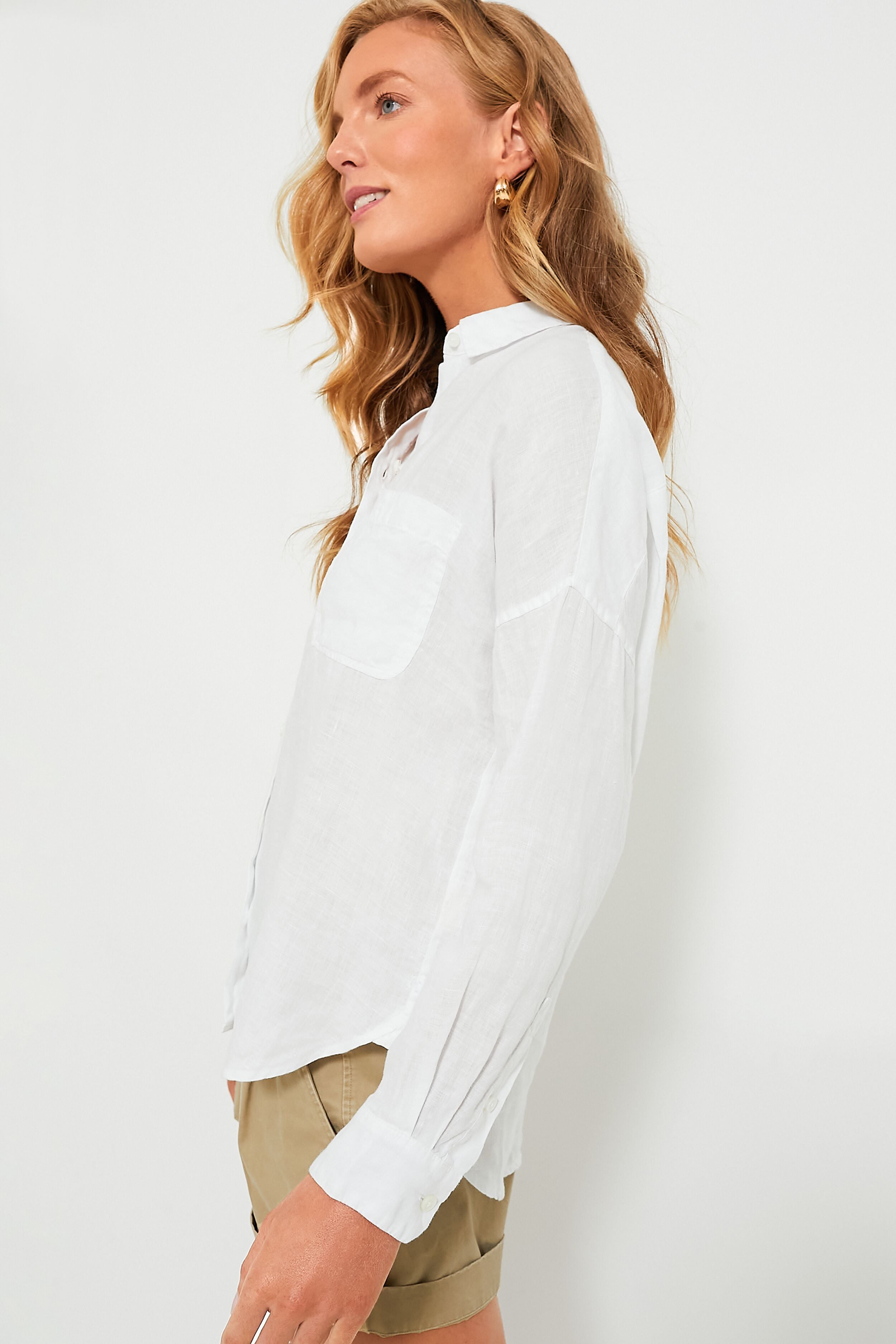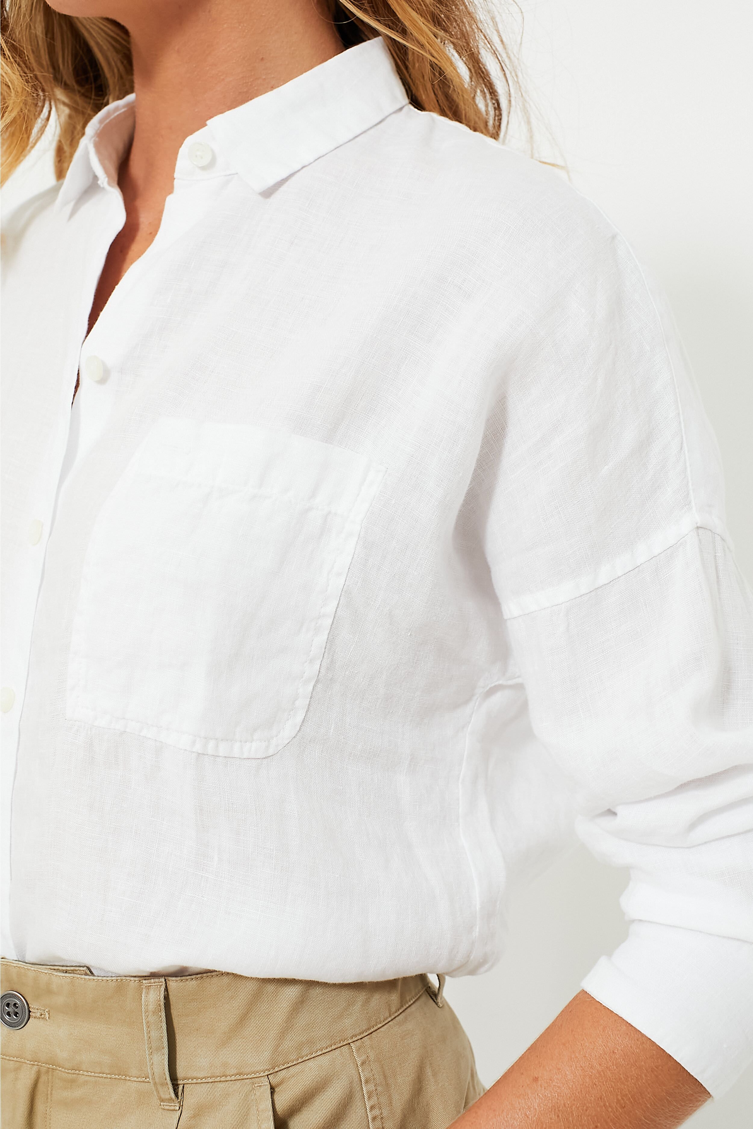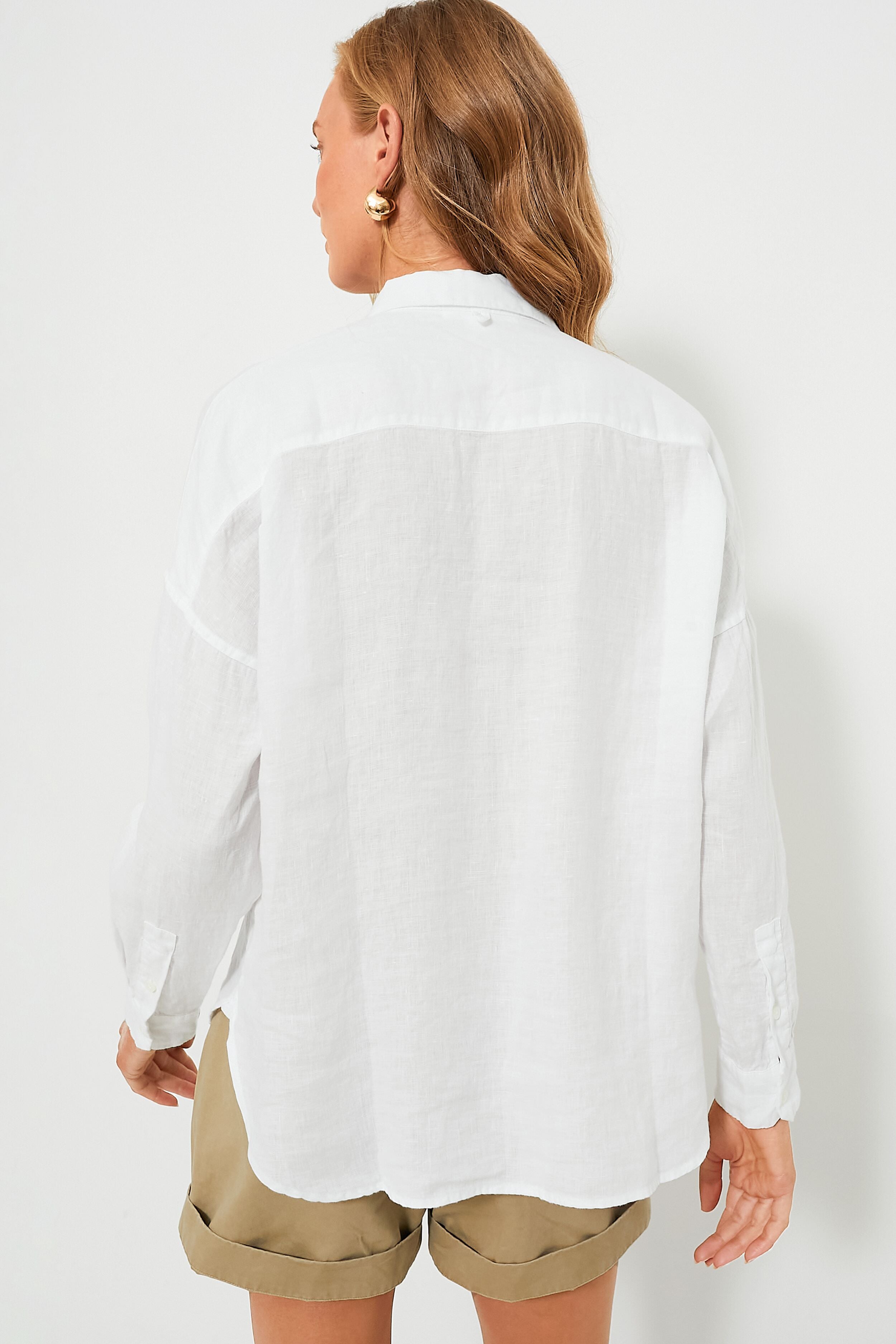If we could only wear one shirt all summer. the White Jo will be the one. Crafted from breezy linen and designed to have the perfect length that looks great tucked in or left out. we love to style it with high waisted shorts and sandals for an elevated everyday look. with denim and sneakers for casual comfort. or with trousers and loafers for an office outfit.