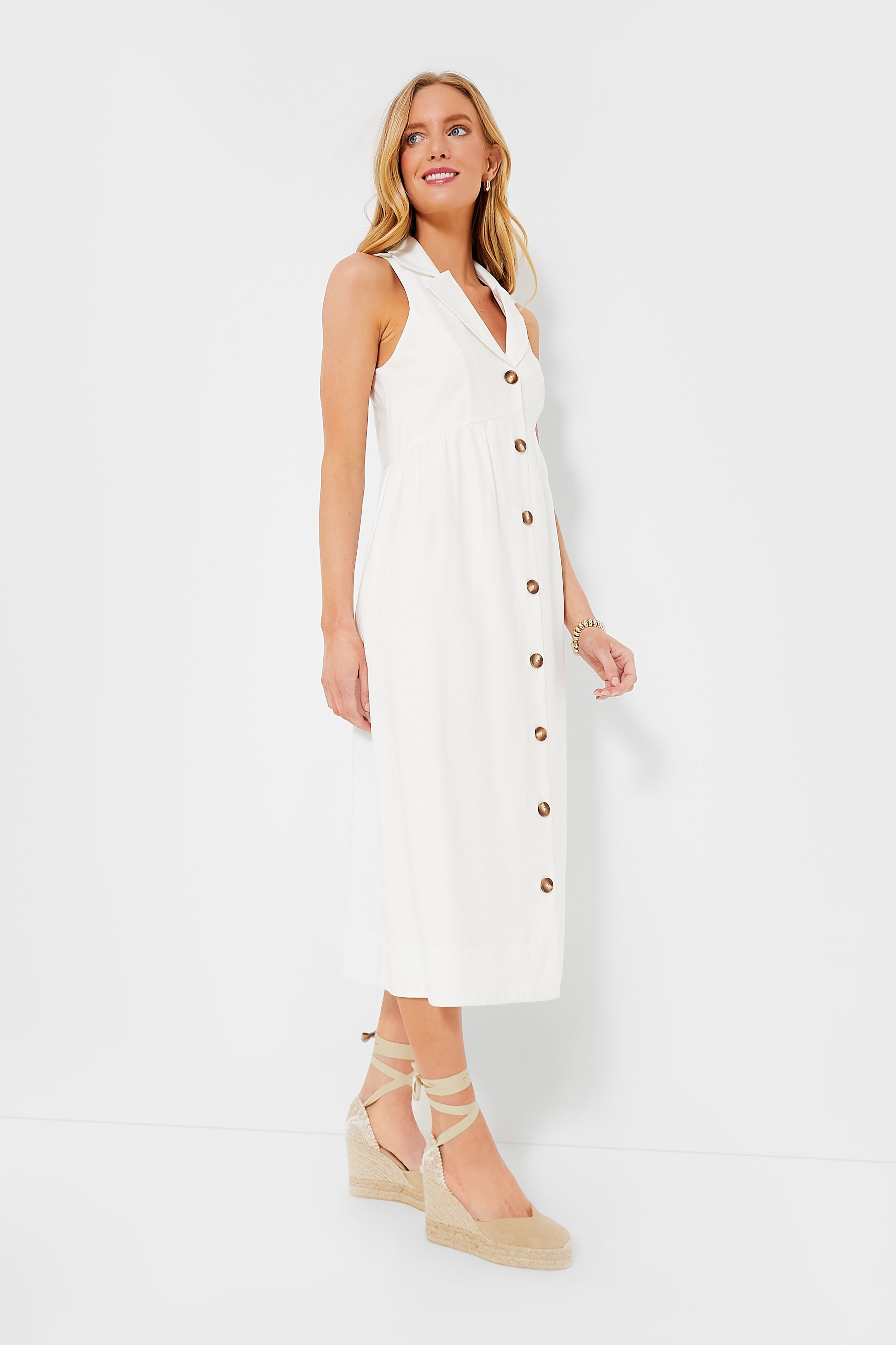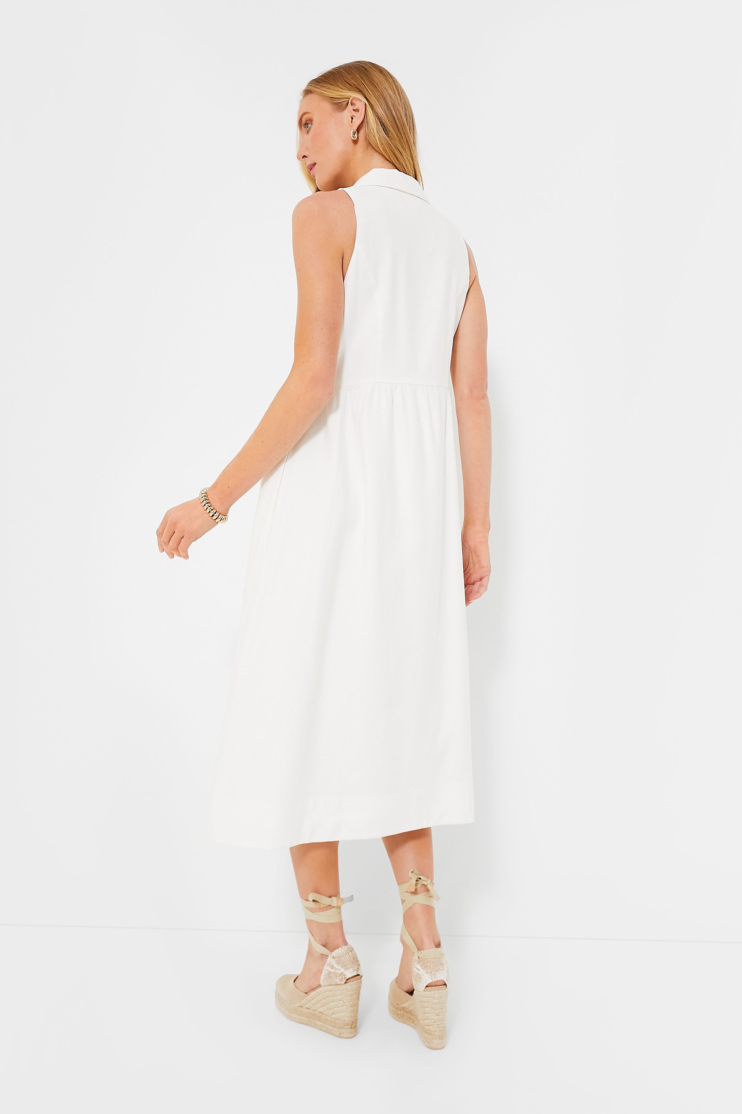 The perfect elevated daytime midi. the White Jules Dress was designed for effortless throw-on-and-go wear while still looking put together. The oversized collar gives a tailored feel while the breezy sleeveless silhouette makes it great for when the weather heats up — plus it has everyone's favorite feature: pockets! From market runs to the office. flats to heels. this style staple can be styled multiple ways for endless occasions.