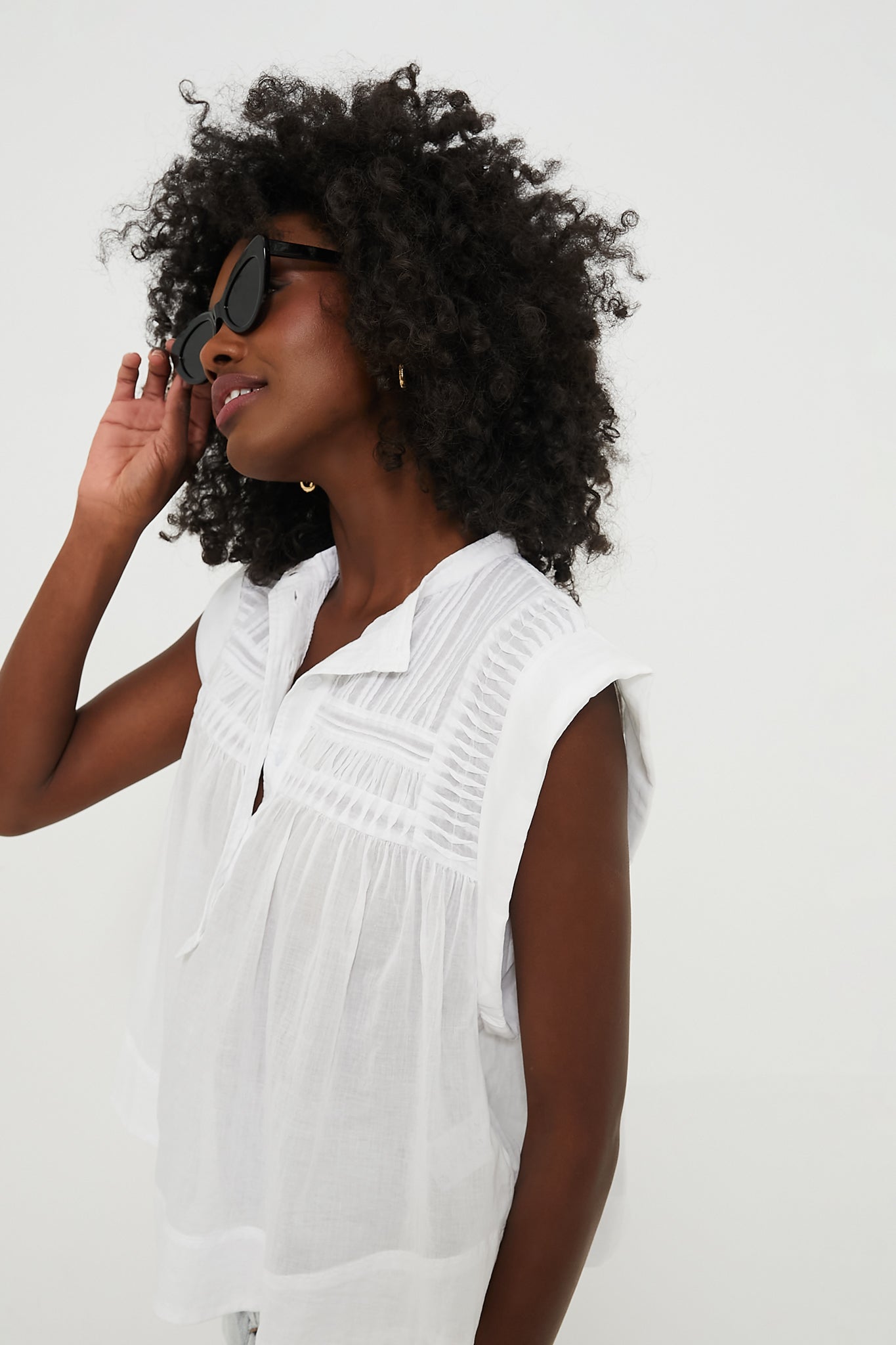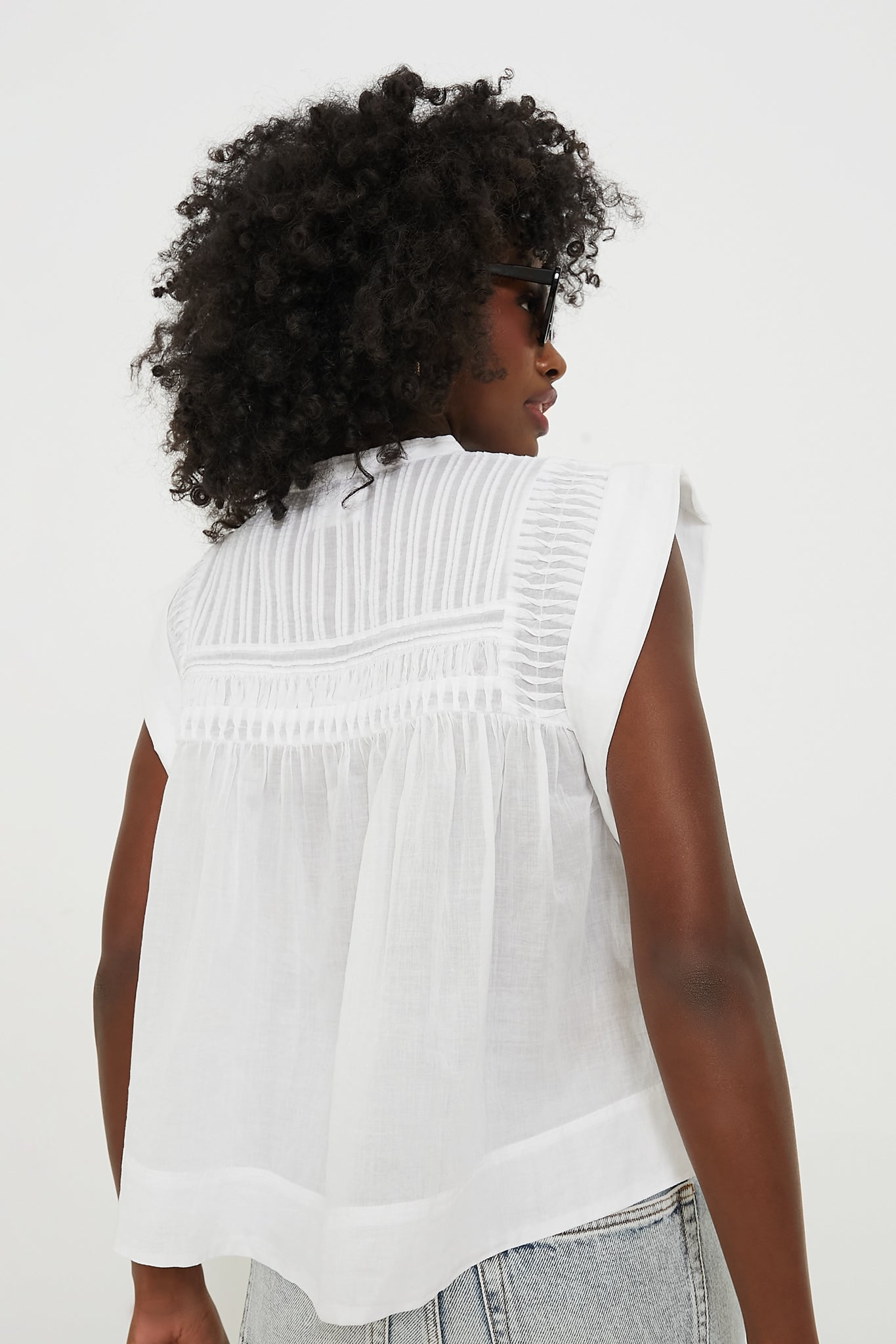 Understated yet unique. this feather-light White Laeza Blouse is cut for a swingy and boxy fit. This semi-sheer style features a stand collar. short sleeves and an elaborate arrangement of pintucks at the yoke. Pair this neutral number with a flowy maxi skirt and espadrilles for a boho-chic look. or with denim and statement jewelry for an outfit that is perfect for dining al fresco.