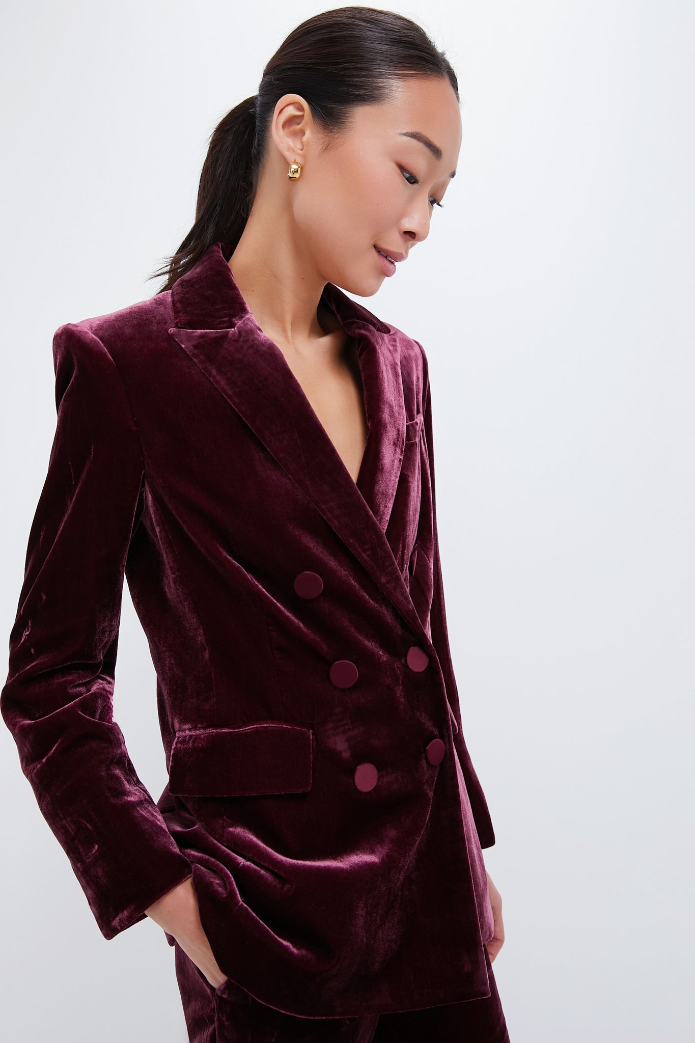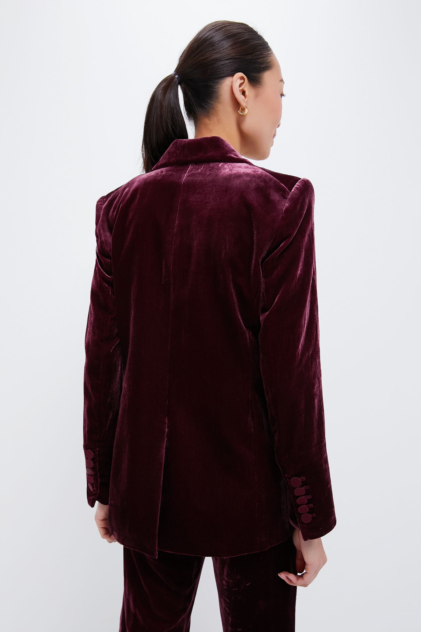 Expertly tailored for an elongated. relaxed fit. the Wine Ellette Velour Dickey Jacket drapes beautifully on the body and is finished with satin buttons and a peak lapel. Whether worn with dresses or jeans or paired with the matching Wine Lebone Velour Pant. this makes for a memorable evening look.